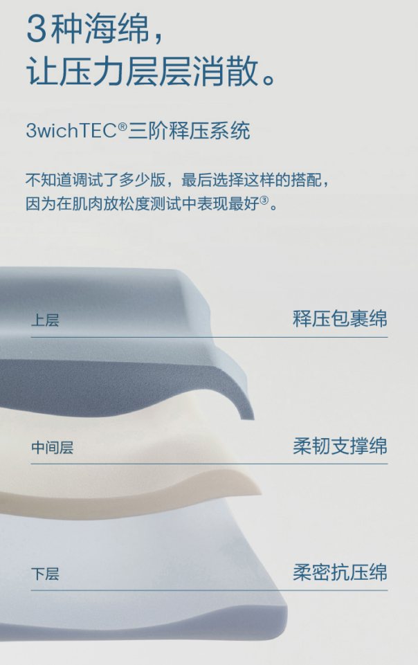 追求深睡体验的用户,可感受到3wichTEC®三阶释压系统带来的渐进式支撑:初始接触时柔软贴合,随后逐步提供稳定承托,避免头部过度下陷。这种结构设计有助于身体快速放松,对提升深睡效率有积极帮助。