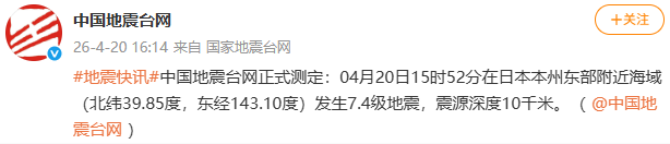 新京报讯 据中国地震台网正式测定:04月20日15时52分在日本本州东部附近海域(北纬39.85度,东经143.10度)发生7.4级地震,震源深度10千米。