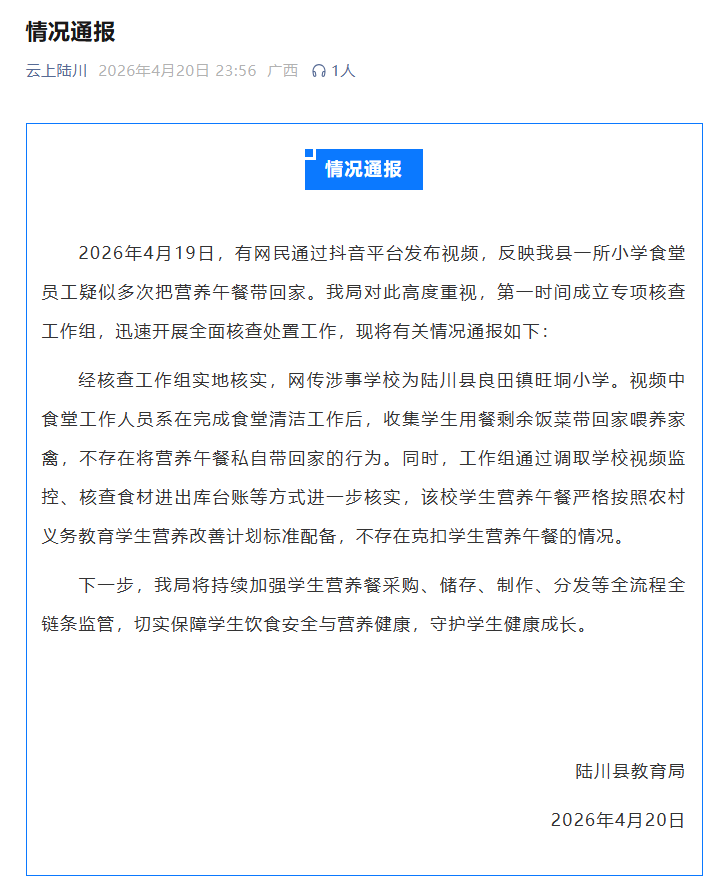 新京报讯 据云上陆川微信公众号消息,2026年4月19日,有网民通过抖音平台发布视频,反映陆川县一所小学食堂员工疑似多次把营养午餐带回家。陆川县教育局对此高度重视,第一时间成立专项核查工作组,迅速开展全面核查处置工作,现将有关情况通报如下: