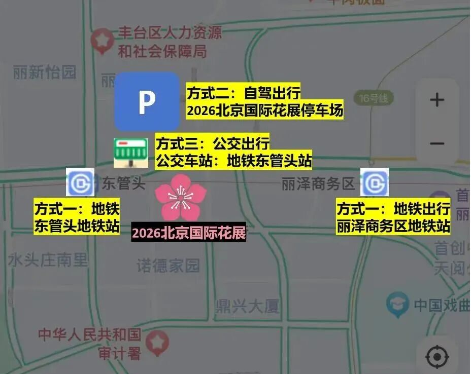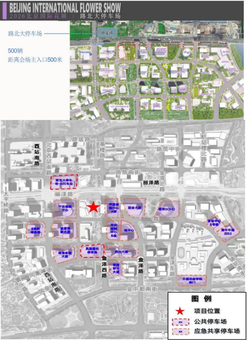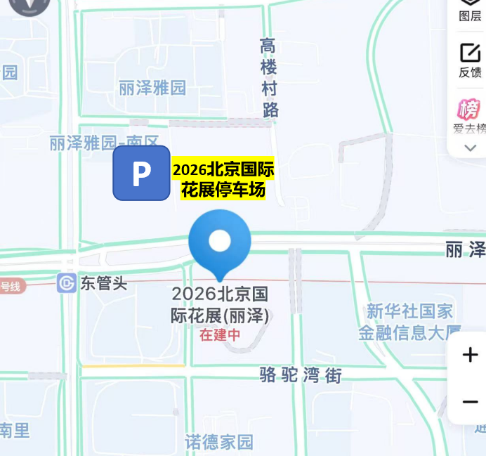 导航至“2026北京国际花展(丽泽)”,现场设有专属停车场,以及周边大厦楼宇停车场(见下图),自驾前往停车后步行至主会场入园赏玩。