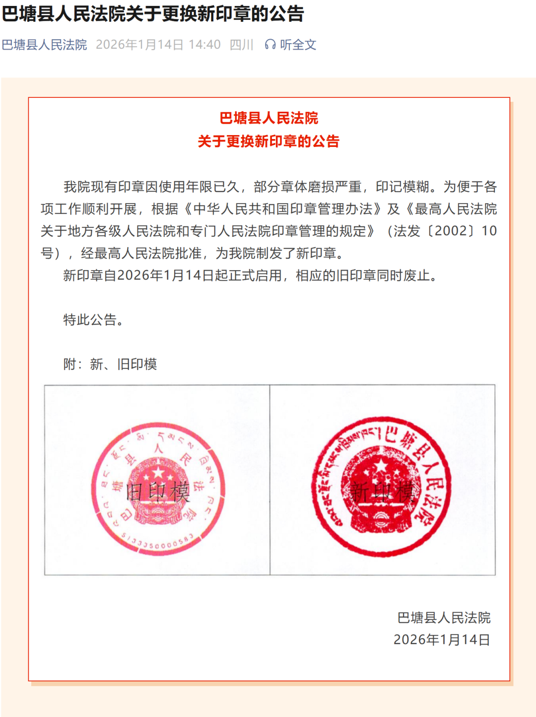 新京报记者了解到,问题出在一枚小小的印章上。今年年初,因为现有印章使用年限久,章体磨损严重、印记模糊,巴塘县人民法院办公室发布了一则更换新印章的公告。公告中写明,根据《中华人民共和国印章管理办法》及《最高人民法院关于地方各级人民法院和专门人民法院印章管理的规定》,最高人民法院批准并为其制发了新印章。