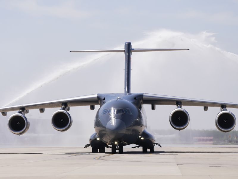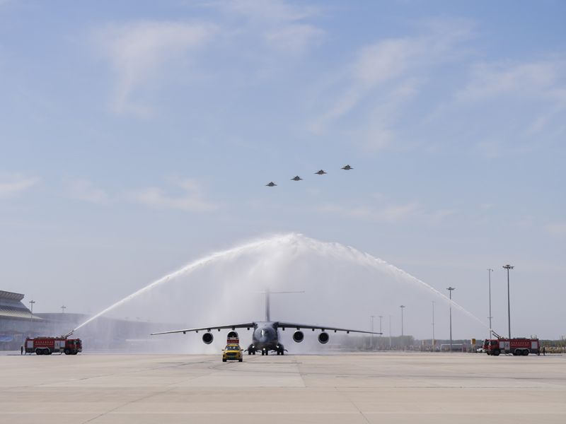 运-20B专机降落沈阳桃仙国际机场后,机场以“过水门”最高礼遇迎接英雄回家。