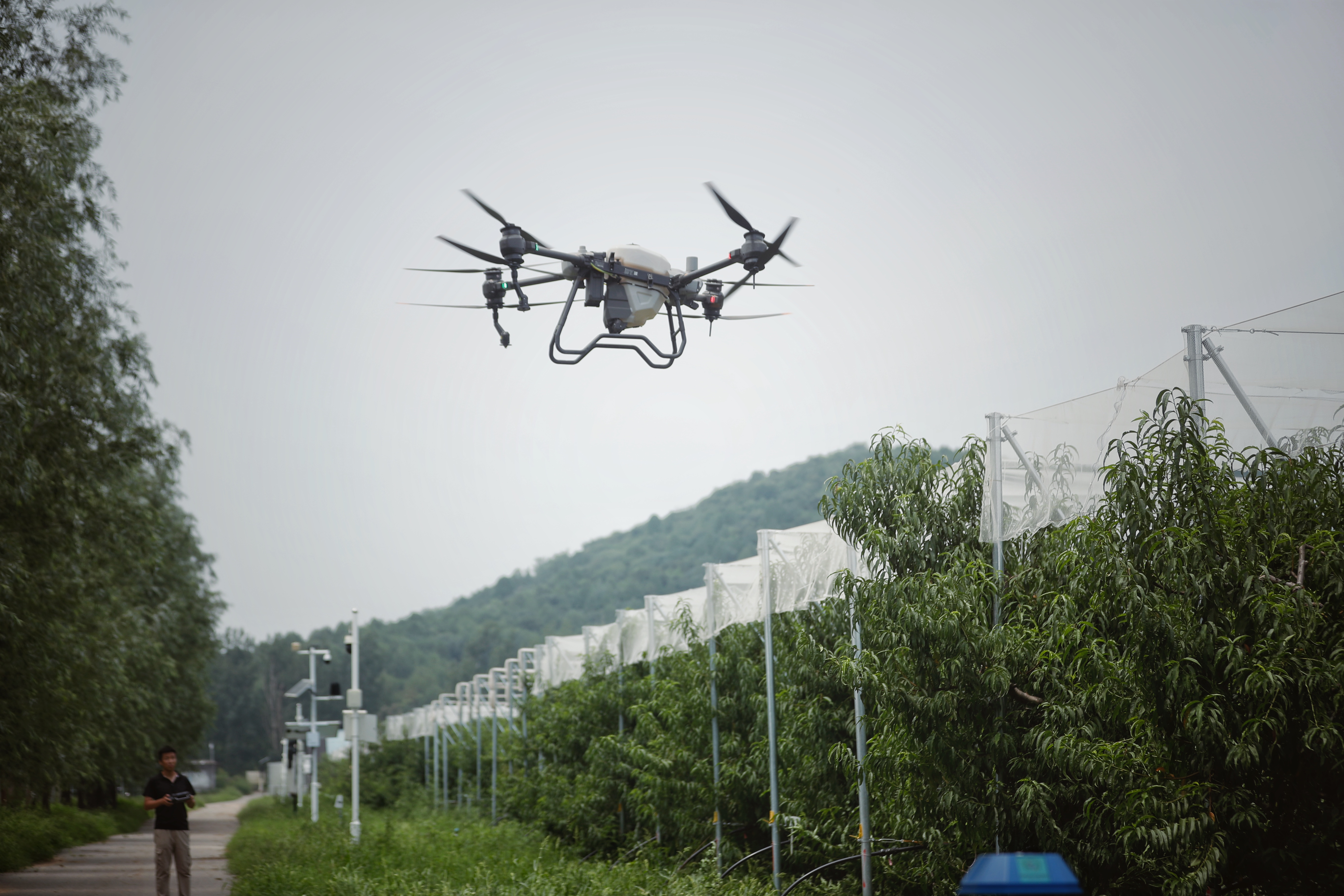 2023年8月8日,平谷区峪口镇未来果园博士农场,一架无人机起飞,对果树进行施药养护。新京报记者 薛珺 摄