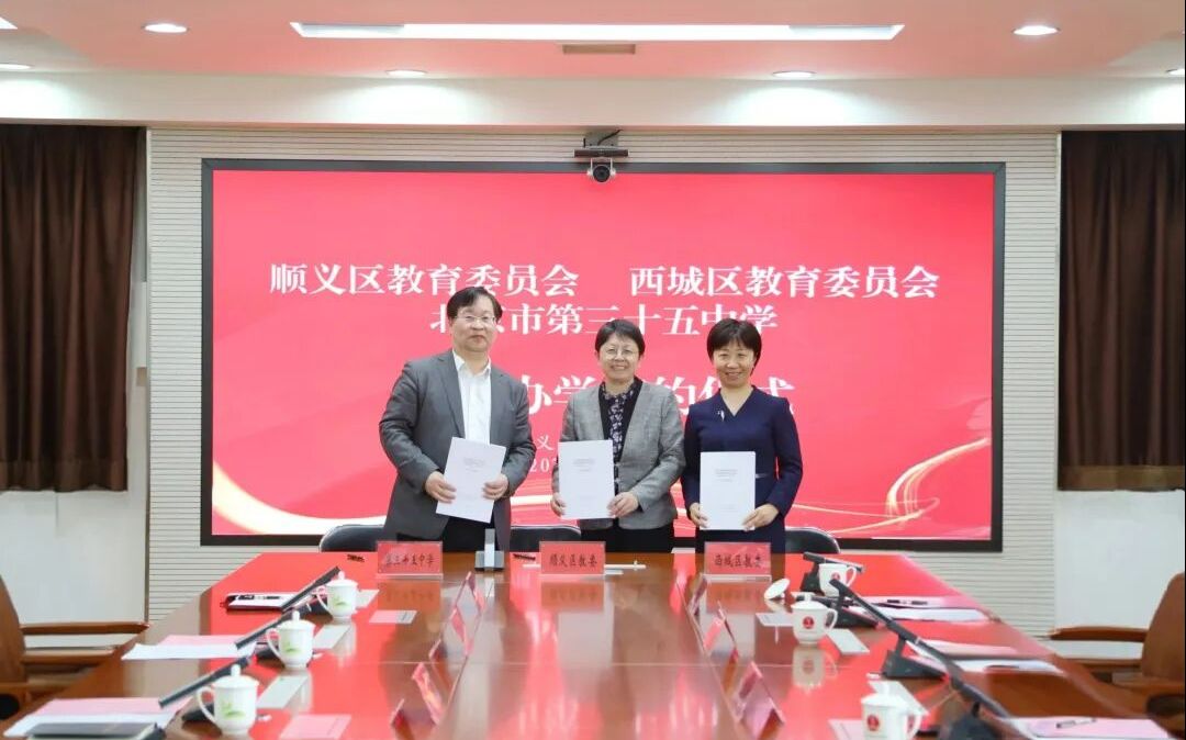 新京报讯 据“北京顺义”微信公众号消息,近日,顺义区教委与西城区教委、北京市第三十五中学合作办学签约仪式举行。根据协议,三方合作共建北京市第三十五中学顺义学校,同时成立由北京市第三十五中学、三十五中学顺义学校、仁和中学、顺义五中组成的教研共同体,进一步推动顺义教育高质量发展迈上新台阶。