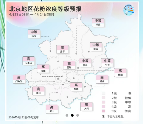 北京地区花粉浓度等级预报(4月23日8时至4月24日8时):