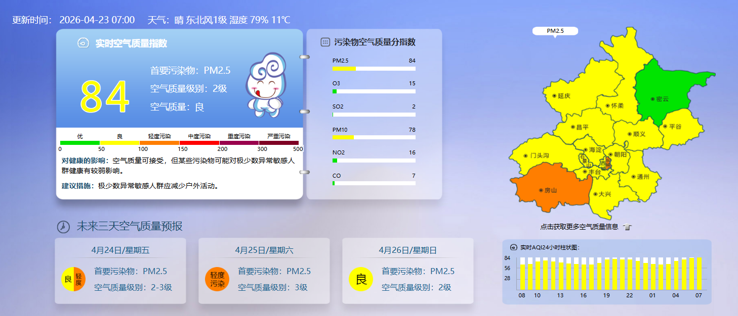 据北京市生态环境监测中心今早7时数据,目前实时空气质量指数84,空气质量良。