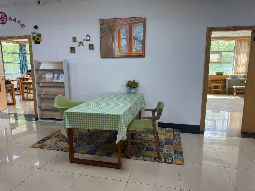 或许是“高龄”的缘故,馆内透着一种时光沉淀后的温馨。每张阅读桌上都铺着桌布、摆着花;墙上的装饰画和壁画虽有些年头,却整洁朴素。担心椅子挪动时发出声响,工作人员还在桌椅下方铺了一层薄薄的地毯,日子久了,地毯也有些陈旧,却透着用心的痕迹。