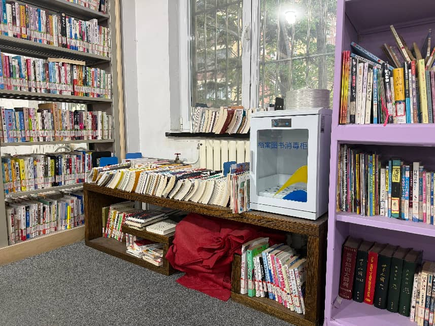 潘家园街道图书馆内放置的档案图书消毒柜。新京报记者 张建林 摄