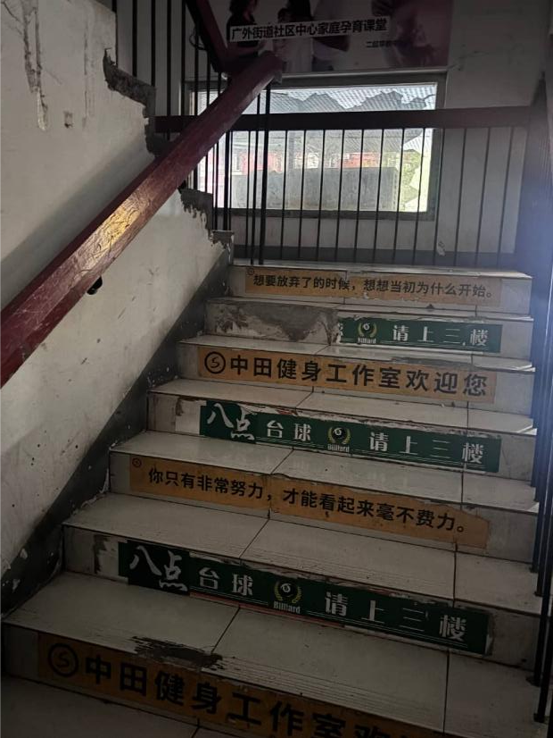 下午4时左右,通往二楼的楼梯光线有些暗淡,台阶上有花花绿绿的广告,有些台阶上的瓷砖已经脱落。上到二层楼,可以看到一张贴在墙上的白纸,用黑色小字指引方向:二层图书馆请一直往里走。