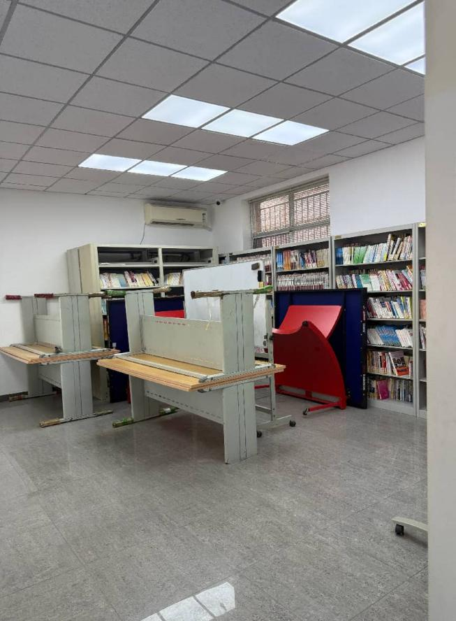 从该门进入,走上一段坡道,可以看到图书馆的标牌,走廊深处便是图书室。大概是工作日人流量少的缘故,起初,走廊并没有开灯。在询问工作人员后,工作人员打开走廊的灯,并介绍了图书室的位置、功能等。