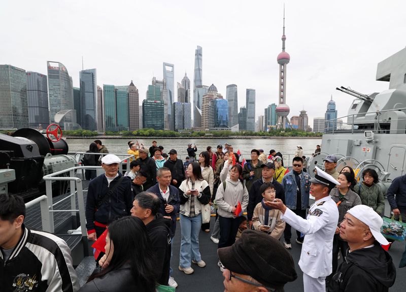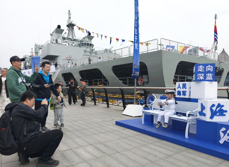 以“上海·海上”为主题的舰艇开放活动4月21日在上海港国际客运中心码头启幕。海军阜阳舰、海军千岛湖舰悬挂满旗,迎接各界群众登舰参观。这是该主题活动第三次与上海地标同框亮相,吸引了大批市民前来参与。
