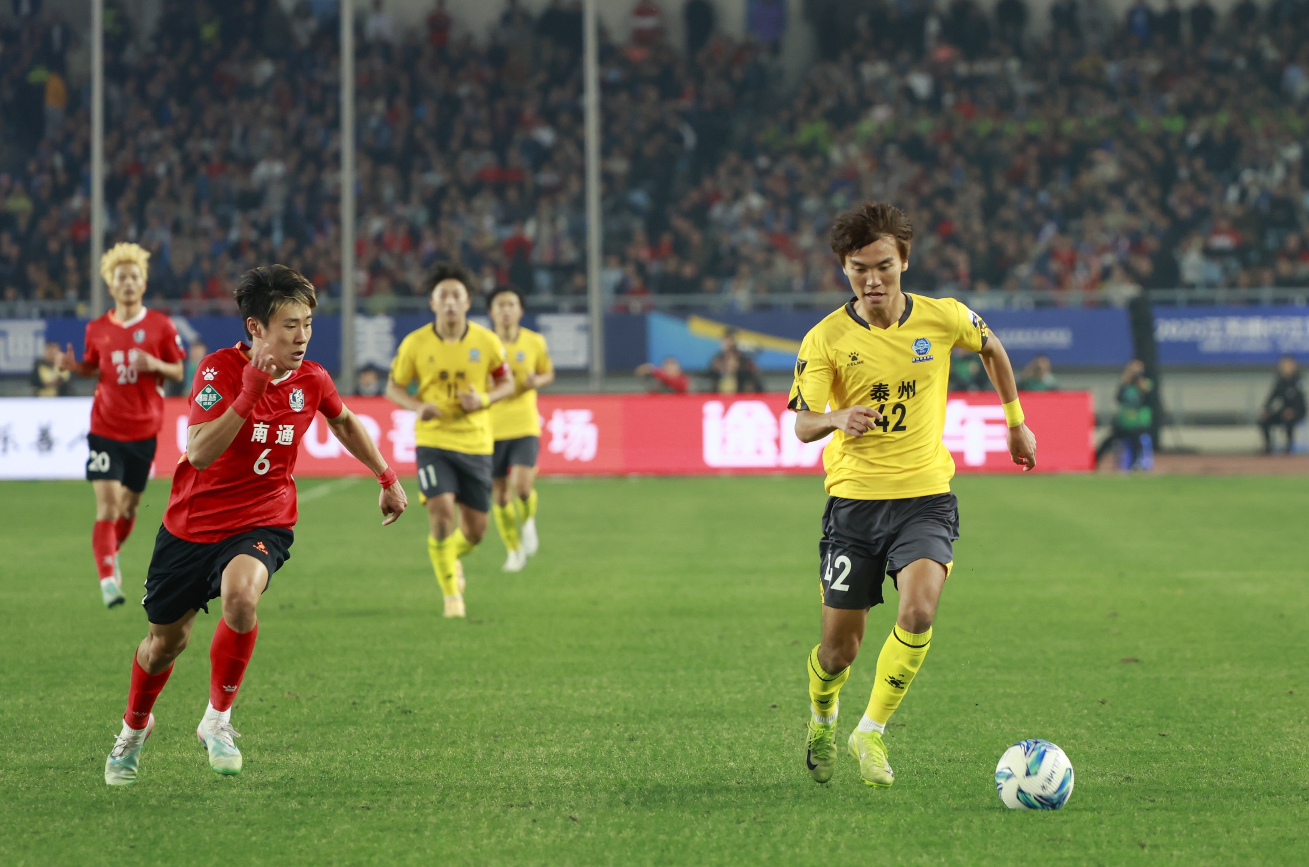 2025年11月1日,江苏南京,江苏省城市足球联赛决赛,南通队员和泰州队员在比赛中拼抢 。图/IC photo