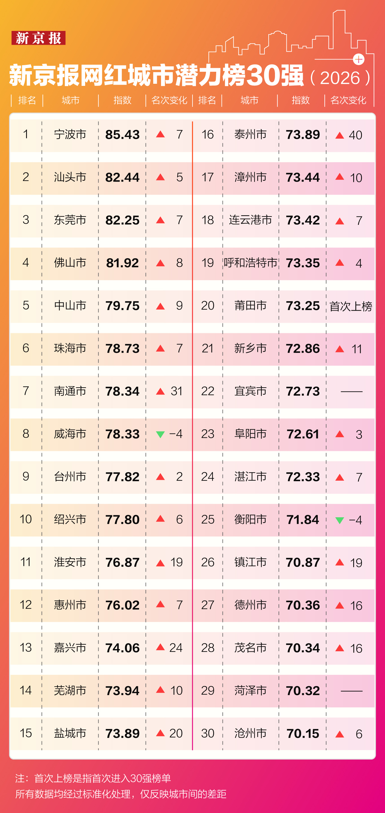 2026新京报网红城市潜力榜单Top 30。