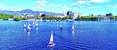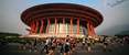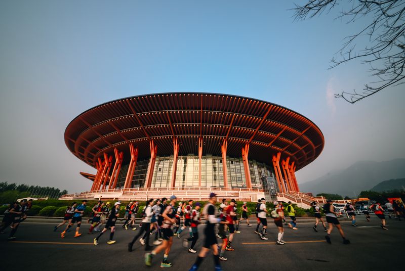 跑者经过怀柔地标建筑北京雁栖湖国际会展中心。
