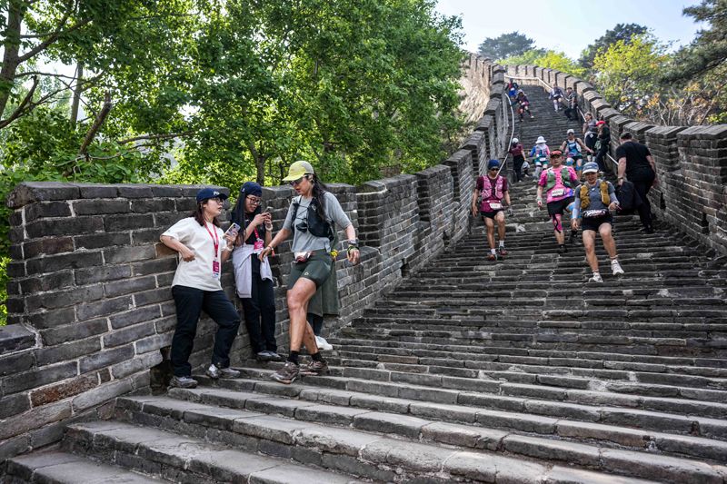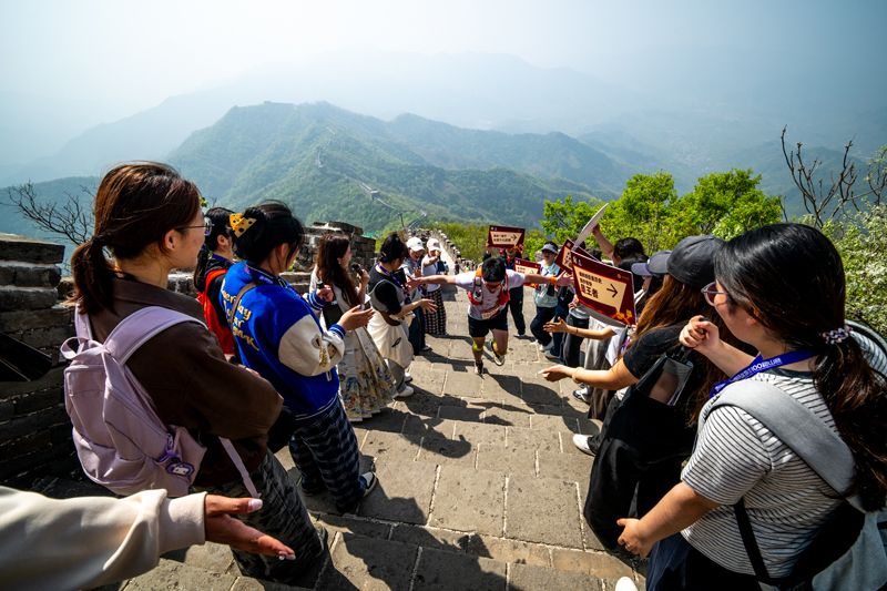跑者沿着长城石阶跑向终点。