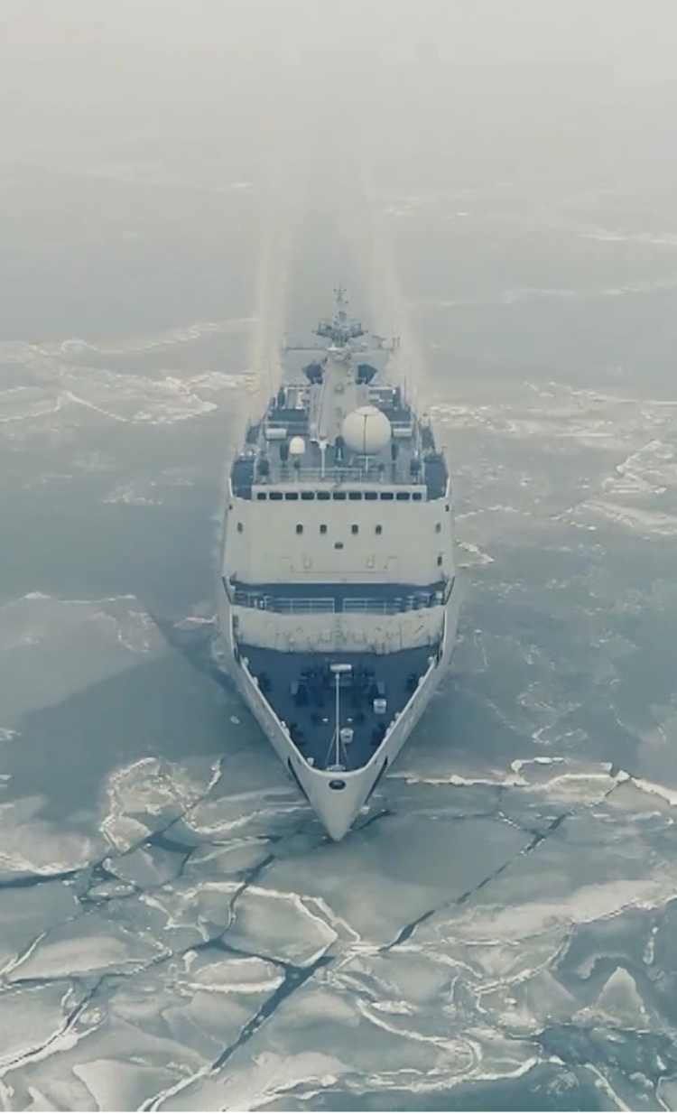 1月29日,人民海军破冰船出航以来,在河北沿岸附近海域连续遭遇非常罕见的浓雾天气。在能见度不足100米的极端条件下,海军舰艇破雾前行。